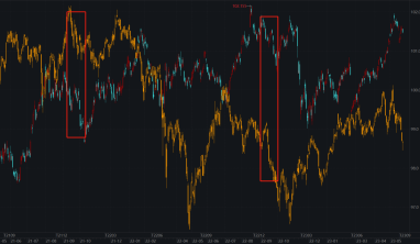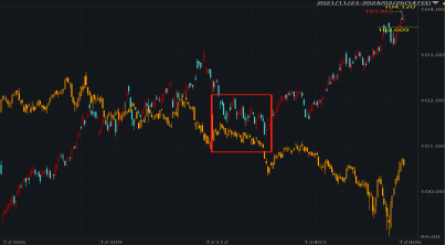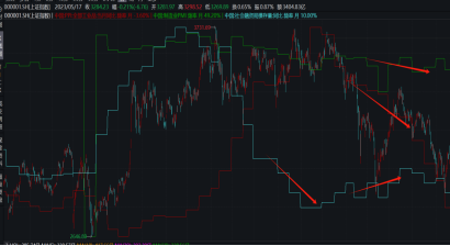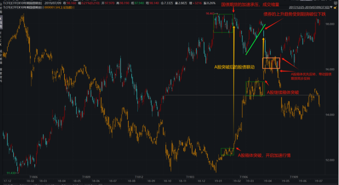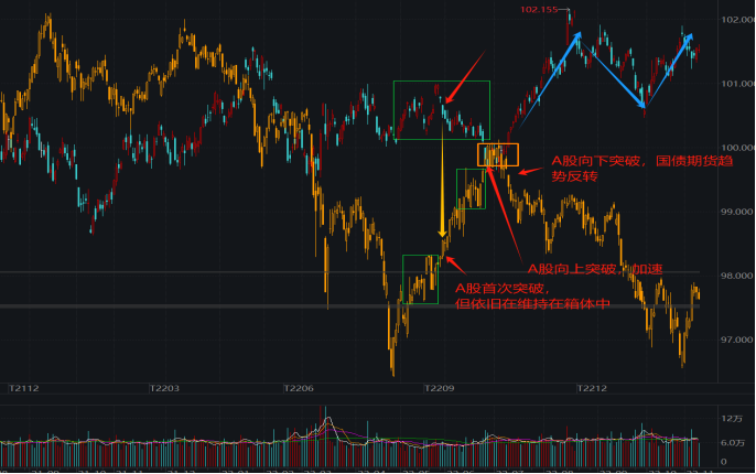 - 第二轮箱体突破,放量,向上跳空,突破箱体,大众交易者开始选择相信A股的牛市行情,纷纷开始止盈债券,开始逐步进入A股市场,所以可以看到第二轮A股箱体突破后,债券的下跌幅度是要远远大于第一轮的下跌幅度的。债券也是直接跳空向下突破支撑线。